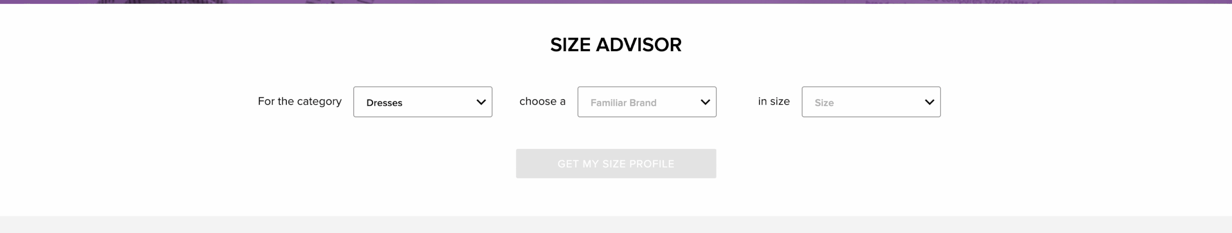 We partnered with UX and leadership to audit the original tool and map friction points. From there, we redesigned the interface with updated colors, typography, and layout. We also created a dedicated landing page that gave members a clear starting point. To make the feature relatable, we introduced the GoldieLocks campaign — showing a member in three sizes of the same dress, a simple visual story that instantly explained “too big, too small, just right.” I art directed and shot the campaign photography, then designed the landing page that paired the visuals with prompts for how to use the feature.